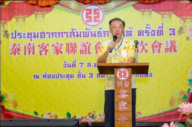 恭請泰國客家總會盧鈞元秘書長作專題報告有關客家社團過去、現在、未來的情況,談到百年前創辦的暹羅華僑客屬會所,當時老前輩們多從事農業生產,尤其勿洞以割橡膠為主,雖然收入有限,但是鄉親們非常團結,有錢出錢,有力出力,建起了勿洞客家會館,尤其是大禮堂可以容納百余席,是全泰客家會館之冠,當年每位客家鄉親都能講流利的客家話、會唱客家歌、當年總會轄下只有勿洞、合艾、董里、萬倫及北欖坡五個單位,現在在總會推動下,內地會館已有37個客家會館,也改名為「泰國客家總會」。