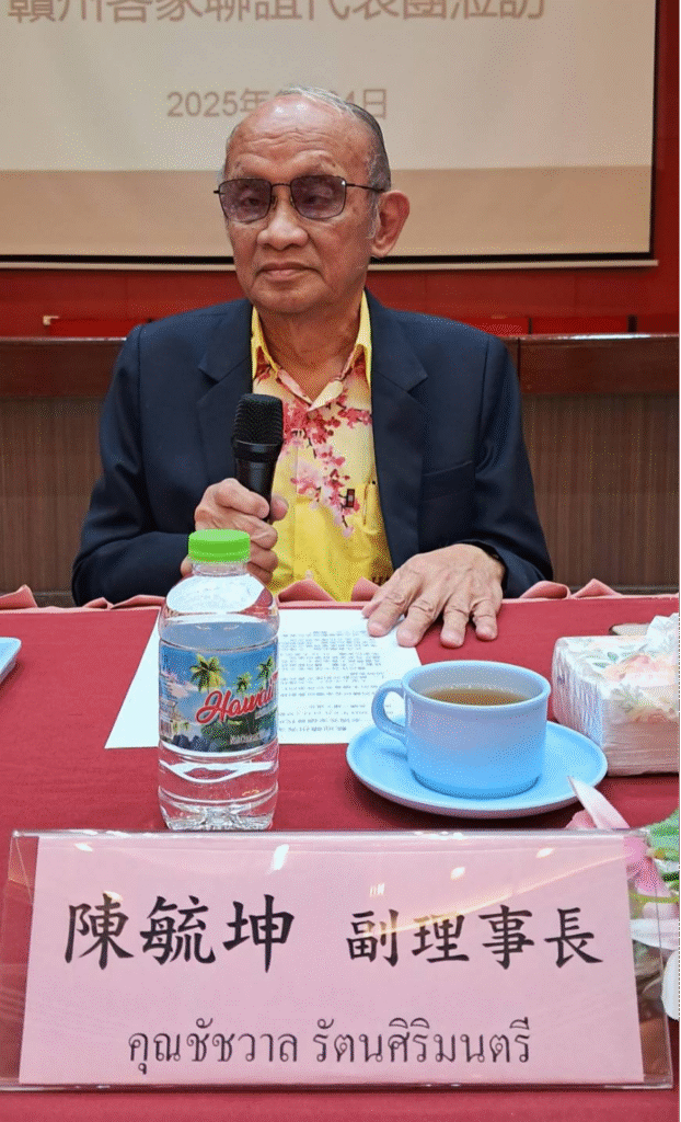 座談會上,代理事長陳毓坤代表全體理事同仁致歡迎詞,表示贛州是全球客家文化的重要發源地,素有「客家搖籃」之美譽。2023年10月份,贛州龍南成功舉辦第三十二屆世界客屬懇親大會,泰國客家總會應邀組團出席,率領來自全泰客家代表團共32人赴會,共襄盛舉。本次劉會長率團蒞訪,不僅深化了我們對贛州在文化傳承、學術研究與產業發展方面的認識,也為未來雙方合作奠定更堅實的基礎。我們期盼藉此訪問,共同弘揚客家精神,促進文化傳承與國際交流。