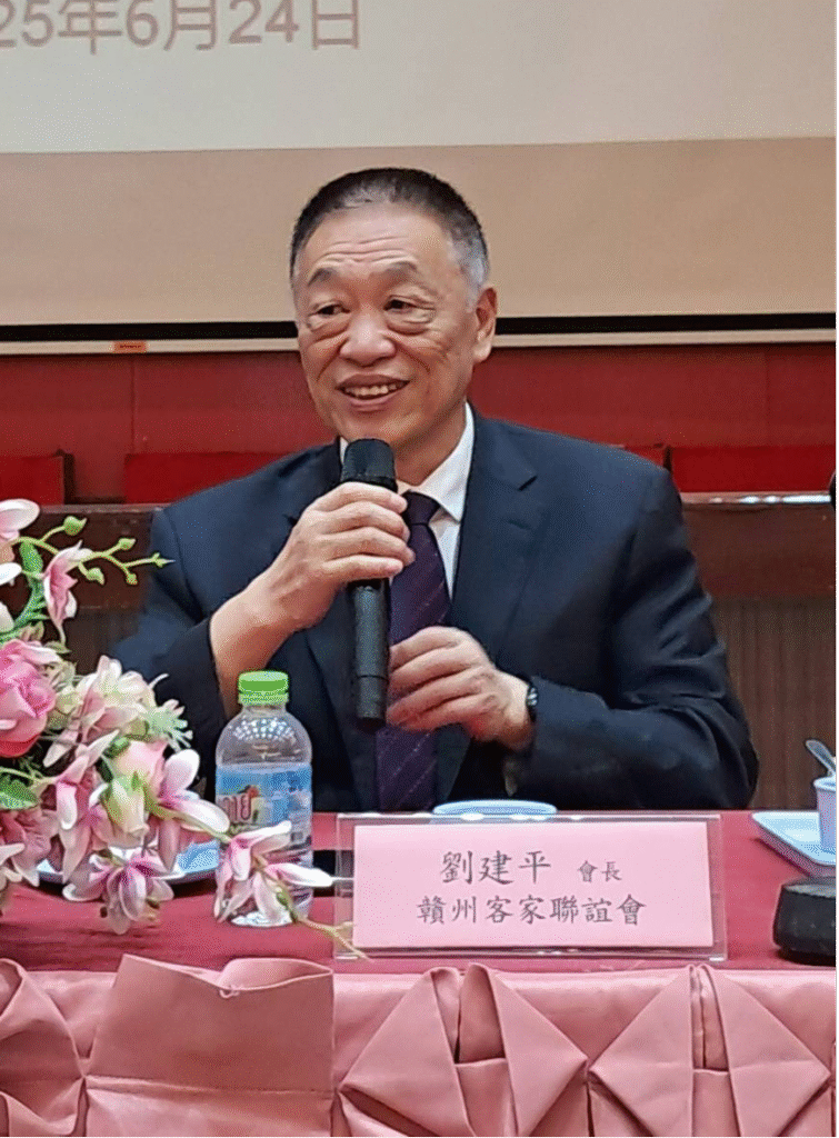劉建平會長在致詞中表示:此次是為感謝赴贛州參加第32屆世客會而進行的回訪。他指出,贛州素有“客家搖籃”之稱,客家先民第一站到了贛州,形成"寧賣祖宗田、不忘客家言"客家文化!客家人世代堅持講客家話、堅持傳承優秀的中華客家文化。贛州轄區面積3.94萬平方公里,人口千萬,絕大多數為講客家話的客家人。當地客家飲食文化豐富,著名客家美食有梅菜扣肉、釀豆腐等。而龍南圍屋作為家、祠、堡三种功能融为一体傳統建築,具有高度歷史與文化價值,目前當地保存的客家圍屋多達376座,占贛南總數七成以上。